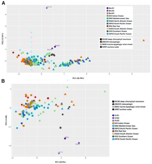 Principal component analysis of metagenome MASH distances from the Tara Oceans dataset and Comau Fjord samples for metagenomes (A) and viromes (B).