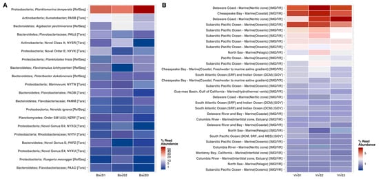 Taxonomic profile of the top 20 most abundant taxa for metagenomes and viromes from the Comau Fjord. Taxonomic information from bacteria was derived from NCBI’s RefSeq database and metagenome-associated genomes from Tully et al., 2018 (A). Virome metadata was derived from IMG/VR and GOV databases (B).