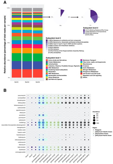 Functional profiling of Comau Fjord microbial communities at the three SEED subsystem levels (A) and their antibiotic resistance profiles (B). Functions are expressed as relative abundance of mapping reads against the SEED database in (A) and as number of gene sequences per million in (B).