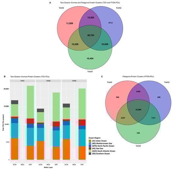 We assembled the quality-controlled reads from each viral sample (Vir S1/S2/S3) using SPAdes v3.8.0 (--meta), then obtained the protein sequences from the viral contigs using Prokka v1.12 (--kingdom viruses --metagenome), which uses Prodigal v2.6.3 for the prediction of open reading frames (ORFs) [62,63,64]. We clustered the Patagonia viral proteins > 60 amino acids in length along with the Tara Oceans Viromes (TOV) proteins using CD-HIT v4.6 with the same parameters used for TOV protein clustering (cd-hit-2d -g 1 -n 4 -d 0, 60% identity, and 80% coverage) [65]. We classified the Patagonia viral protein clusters present in TOV samples according to the Tara metadata using an in-house script available at https://github.com/Vasco-Varas/Bioload (1 November 2022). Then, we used the Patagonia viral proteins that were not similar to any TOV proteins to form new clusters with two or more ORFs (Patagonia Protein Clusters (PTGN PCs)), using CD-HIT under the same settings as the TOV (cd-hit -g 1 -n 4 -d 0 -G 0, 60% identity, and 80% coverage).