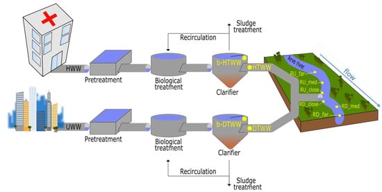 Wastewaters (WW) can have complex chemical and microbiological contents [1]. The 16S rRNA gene DNA metabarcoding approaches showed domestic WW to harbor significant numbers of Pseudomonas, Acinetobacter, Arcobacter, Trichococcus, Tetrasphaera, Rhodoferax, Rhodobacter, and Hyphomicrobium [2,3,4]. Similar analyses performed on hospital WW revealed bacterial taxa restricted or in higher numbers in these waters than the domestic ones such as the Comamonas, Sphingobacterium, Ochrobacterium, Stenotrophomonas, Shinella, Diaphorobacter, Agrobacterium, Achromobacter, Phenylobacterium, and Flavobacterium [5]. This differentiation of sewer bacterial WW communities was further confirmed after a passage through a wastewater treatment plant (WWTP) [6]. Urban- and hospital-treated WW showed distinct bacterial communities matching their origin but also their chemical contents [6]. The hospital WW (HWW) was found to contain specific pharmaceuticals not found in a domestic sewer such as iohexol, amoxicillin, and flucloxacillin [7]. The domestic WW showed higher occurrences of pesticides such as organochlorines, and of motor engine contaminants such as hydrocarbons, or metallic trace elements [8] like lead, copper, and cadmium [9,10,11].