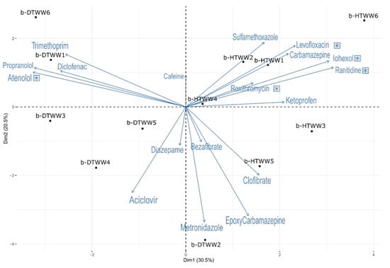 Principal component analysis (PCA) of the 18 pharmaceuticals monitored among the blueschist biofilms developing from clarifier waters (Table S1). The PCA was computed from datasets generated from biofilms recovered from the clarifiers of the domestic (b-DTWW) and hospital (b-HTWW) treatment lines of the SIPIBEL experimental site (Figure 1). Asterisks highlight significant (Wilcoxon non-parametric tests, p < 0.05) differences between the monitored parameters among the b-HTWW and b-DTWW.