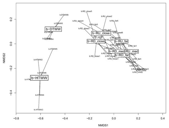 Non-metric multidimensional scaling (NMDS) representation of the Bray-Curtis dissimilarity matrix computed from the tpm gene ASV profiles (Table S3) of biofilms (b-) sampled from HTWW (hospital sewer treated wastewaters), DTWW (domestic sewer treated wastewaters) and the river compartments upstream (b-RU) or downstream (b-RD) the WWTP outlet. Pairwise ANOSIM statistical tests showed significant differentiations between the tpm genetic profiles according to the origin of the samples (p-value < 0.01). River biofilm sampling sites were at 10 m from the WWTP outlet (close), at 500 m (medium (med)), and 8 km (far). See Table S1 for a full description of all samples used in this analysis.