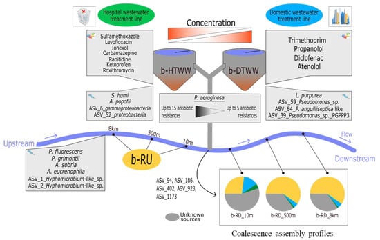 Illustration and overview of the main results observed during this study. Specific pharmaceuticals, tpm ASV, and inferred species from b-HTWW, b-DTWW, and river biofilms are indicated according respectively to Figure 1 and Tables S7 and S8. The coalescence of the tpm ASV from the b-TWW samples among the river biofilm samples are indicated according to Table 1. Color codes differentiate the compartments investigated in this study.