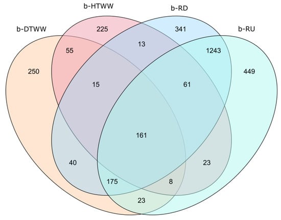 Venn diagram showing the distribution of tpm ASV among rock biofilms developing from domestic treated wastewaters (b-DTWW), hospital treated wastewaters (b-HTWW), and river surface water located downstream (b-RD) or upstream (b-RU) the selected WWTP outlet.