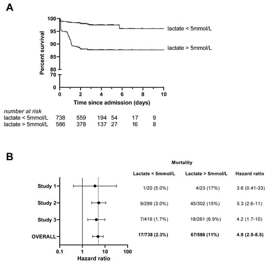 The median lactate level at admission was 4.6 mmol/L (IQR 2.6–8.5) and 586 patients (44%) had hyperlactatemia (lactate > 5 mmol/L). Mortality in Studies 1, 2, and 3 was 12.0%, 9.0%, and 3.7%, respectively, and the pooled mortality was 84/1324 (6.3%). There were 67 deaths (11%) among children with hyperlactatemia at admission and 17 deaths (2.3%) among children with normal lactate (p < 0.0001). Hyperlactatemia was associated with a crude HR of mortality of 5.3 (95%CI 3.1–9.0, p < 0.0001, Figure 1A). After adjustment for age, sex, clinical severity score (fixed effects), study, and site (random effects), the adjusted HR (aHR) was 3.0 (95%CI 1.8–5.3, p < 0.0001, Table 2). In the subgroup of 690 patients with parasitemia confirmed by microscopy, the aHR was 4.0 (95%CI 1.7–9.2, p < 0.0001). Subgroup analysis by study is shown in Figure 1B.