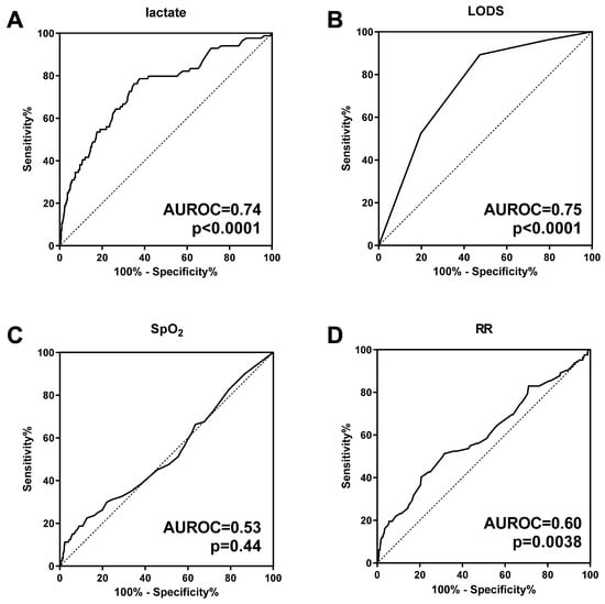 We next used ROC curve analysis to compare lactate with other predictors of mortality (Figure 2). The AUROC for lactate was 0.74 (95%CI 0.68–0.80, p < 0.0001). The optimal cut-off (threshold of maximum discrimination) using the Youden index for the ROC curve was 5.7 mmol/L (sensitivity 62%, specificity 79%). Lactate had similar discriminatory power to the LODS, a composite clinical severity score (AUROC 0.74 vs. 0.75, p = 0.80, Figure 2A,B). In combination with LODS, lactate improved the prediction of mortality over LODS alone (AUROC 0.80 vs. 0.75, p = 0.010). With respect to other clinical signs, SpO2 was not a statistically significant predictor of subsequent mortality (AUROC 0.53, p = 0.44, Figure 2C). Respiratory rate (RR) was a weaker predictor of mortality (AUROC 0.60, p = 0.0038, Figure 2D).