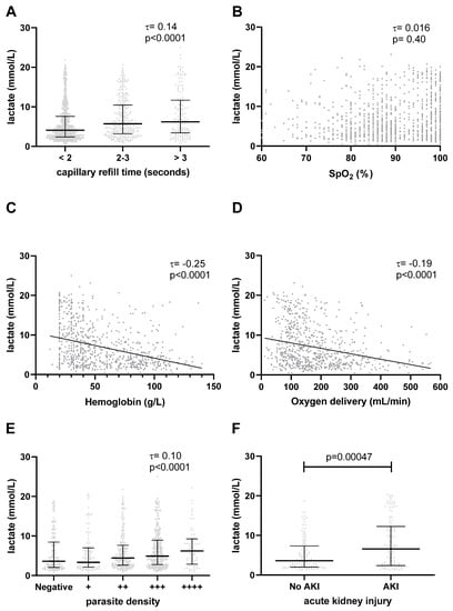 Mechanistic insights derived from the association of lactate with other clinical and laboratory variables. (A) Patients with prolonged capillary refill time had higher blood lactate concentrations than patients with normal capillary refill times. (B) Lactate was not correlated with oxygen saturation (SpO2). (C) Hemoglobin concentration and (D) global oxygen delivery () were inversely correlated with lactate levels. (E) Higher circulating parasite densities were associated with higher lactate levels. (F) patients with AKI had significantly higher blood lactate concentrations than patients without AKI. Together, these data suggest that impaired tissue oxygenation (poor perfusion, low blood oxygen carrying capacity, and local hypoxia due to parasite sequestration) as well as impaired renal lactate clearance contribute to hyperlactatemia. Kendall’s tau (τ) was used to determine nonparametric rank correlation coefficients between variables.