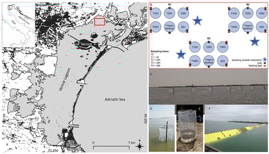 With the climate change effects intensifying, extreme events are becoming more and more frequent, severe, and unpredictable, and sea level is predicted to rise between +0.6 and +1.2 m within the end of this century [1]. Coastal and lagoonal areas are among the most vulnerable environments to these derangements, but also among the most valuable ones on Earth, providing a range of ecological, cultural and socioeconomic services [2,3]. The Venice Lagoon (northern Adriatic) represents an important study case for both socio-economic interest and ecosystem preservation, which has undergone considerable changes in the last 30 years [4]. In the last century, the lagoon has been subjected to several anthropogenic modifications, and, since 2004, the morphology of the lagoon inlets has been strongly modified by the construction of MOSE (Italian acronym for “Experimental Electromechanical Module”) (https://www.mosevenezia.eu, accessed on 23 March 2023), with consequent alterations on the exchange of fine sediments between the inner basin and the sea [5,6]. MOSE is a system of mobile barriers (Figure 1F) positioned at each of the three inlets of the Venice Lagoon, built to prevent flooding of Venice City. Under normal conditions, the barriers lie on the seabed, and are raised when flood events (tide above 110 cm) are predicted. Since the MOSE start-up, the average closures have lasted from a few hours to 24 h and the very high tide conditions have occurred four times per year (Venice City Hall website www.comune.venezia.it, accessed on 23 March 2023). According to [7,8], it is predicted that, in the near future, the barriers will have to be closed more than 200 times and for 1000 h per year. Since its construction, the MOSE system has led to important modifications to the lagoon [6,9], and its increasingly frequent operating times will progressively exacerbate the lagoon’s transformation, implying further changes in the hydrodynamics [10], the lengthening of the water renewal period throughout the lagoon [11], and the alteration of sediment fluxes, pollutants and organisms [12,13] and wetland morphodynamics [14]. Moreover, if the closure occurs during the warm season, with high water temperatures and low hydrodynamic conditions, the higher organic load may lead to more persistent and severe hypoxic/anoxic events [15], with severe consequences for the lagoonal ecosystem. In a recently published study [16], the authors reported that, in sites confined by the MOSE closure, sediments exert an important depleting action on dissolved oxygen already at water temperatures just above 20 °C, which are not particularly high for the lagoon.