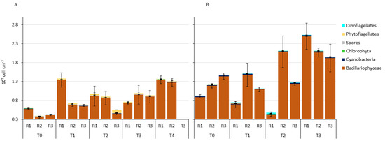 In July 2019, the total MPB abundance ranged from 39,000 ± 1742 cells cm−3, observed in one replicate of T0, and 137,600 ± 4064 cells cm−3 obtained in one replicate of T1 (Figure 2A). The average abundance of the replicates was the lowest at T0 (48,200 ± 12,019 cells cm−3), while the highest was recorded at T4 (134,250 ± 4030 cells cm−3).