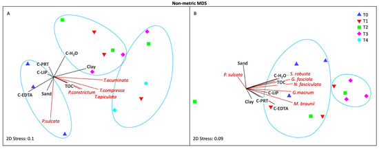 Non-metric MDS ordination plots calculated on the overall MPB abundances (A) from T0 to T4 in July 2019 and (B) from T0 to T3 in October 2020. The most abundant species (RA ≥ 5%) and the environmental variables are overlaid as vectors; circles delimit clusters obtained applying the SIMPROF analysis (complete linkage, similarity threshold = 0.05, n. of permutations = 999). (C-LIP = lipids, C-PRT = proteins, C-H2O = water soluble carbohydrates, C-EDTA = EDTA soluble carbohydrates).