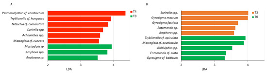 Further, we applied the LEfSe analysis to identify which MPB taxa were the most discriminating between the beginning (T0) and the end of the experiment (T4). The taxa Mastogloia sp., Amphora spp. and Anabaena sp. significantly decreased in abundance at T4, while six other taxa i.e., Psammodyction cf. constrictum, Tryblionella cf. hungarica, Nitzschia cf. commutata, Mastogloia cf. cuneata, Achnanthes spp. and Surirella spp. increased (Figure 5A).