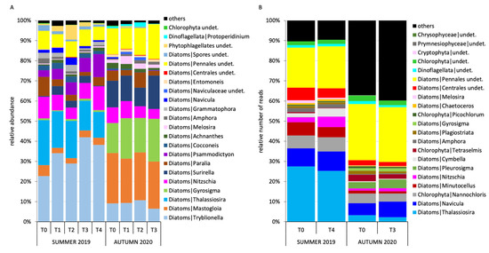 Comparison between the taxonomic composition of the MPB community obtained through (A) classical microscopy and (B) 18S RNA gene sequencing. The species/ASVs representing relative number of cells/number of reads ≥ 0.5% are shown; averages of three enclosure replicates at each sampling time are represented.