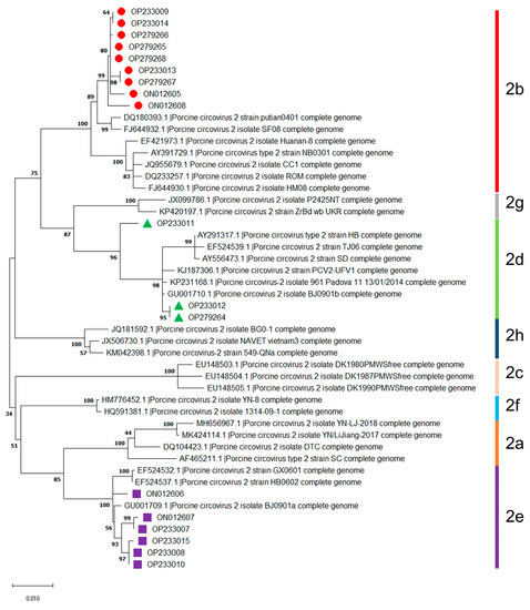- Parthiban, S.; Ramesh, A.; Karuppannan, A.K.; Dhinakar Raj, G.; Hemalatha, S.; Parthiban, M.; Senthilkumar, K.; Balasubramaniyam, D.; Sumanth Kumar, R.; Ranganatha, S.; et al. Isolation and genetic analysis of Porcine circovirus 2 in southern India evidences high circulation of Porcine circovirus 2d genotype. Mol. Biol. Rep. 2022, 49, 11829–11846. [Google Scholar] [CrossRef]