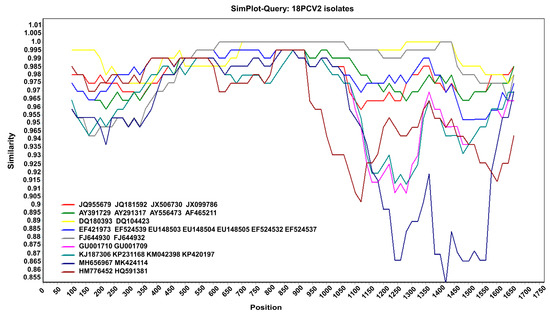 Recombination analysis. Nucleotide sequence similarity was assessed using SimPlot v.3.5.1. Sequence similarity between the 18 PCV2 isolates and 29 reference sequences.