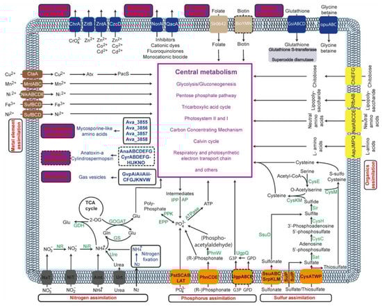 From an energy and matter perspective, the ubiquitous presence of CyanoHABs attests to the fact that bloom-forming cyanobacteria have metabolic machinery able to effectively assimilate external nutrients and convert them to biomass, aided by favorable weather or climate conditions [35,36]. That is to say that CyanoHABs are the outcomes of the synergistic interactions between the superior ecophysiology of cyanobacteria and eutrophic conditions. Indeed, both factors have been well established by field work, laboratory simulations, genomics, and metatranscriptomics. Specifically, the roles of nutrients, either trace elements or macronutrients, have been recognized as important drivers for CyanoHABs in a consensus and large survey [10,37]. Meanwhile, the metabolic pathways importing and converting available nutrients have been found to be more complete and have more copies of genes encoded in the genomes of bloom-forming cyanobacteria than non-blooming cyanobacteria [38,39] (Figure 2). These metabolic pathways and their genomes are now curated in a webserver CyanoPATH [39]. Most of the functions are peripheral and involved in nutrient uptake and precursor processing to feed central metabolism, and the rest are in the central metabolism converting metabolites for the synthesis of macromolecules in anabolism. Interestingly and expectedly, the gene expression levels of these pathways are correlated with their completeness [38]. To sum up, at the population level, the synergistic interactions between superior metabolic capabilities and elevated nutrients suffice as a working mechanism of CyanoHABs. We call this working mechanism a special mechanism, as opposed to the general mechanism proposed in Section 5.