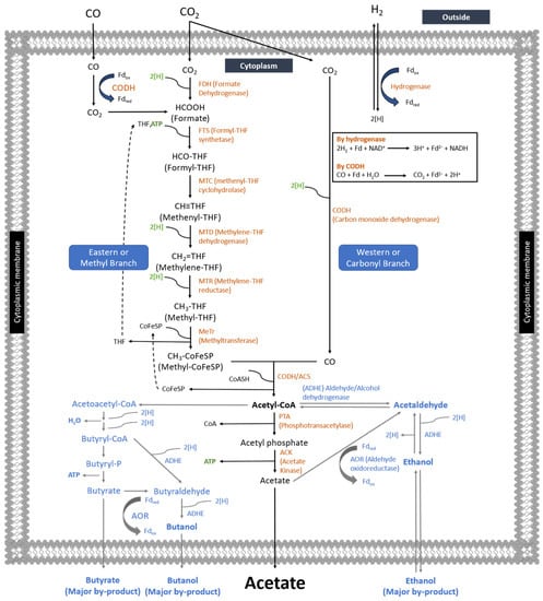 Chemolithoautotrophic acetogens utilize inorganic carbon (CO2) as the carbon source for product and cell formation through the eastern and western branches of WLP [44]. In the western branch, the conversion of CO2 into acetate involves several enzymes and proteins that are successfully identified: (1) CODH, (2) CODH/ACS, (3) corrinoid iron-sulfur protein (CoFeSP), two subunits, (4) MeTr, whereas the enzymes in eastern branch involve: (1) FDH, (2) FTS, (3) MTC, (4) MTD, and (5) MTR [111,112]. According to Figure 2, when acetogens grow with CO2 and H2 without CO in the fermentation media, CODH catalyzes the reduction of CO2 into CO in the western or carbonyl branch using the reducing equivalents produced from hydrogen oxidation. Meanwhile, CO2 is further reduced to form formate in the eastern branch. The formate formed in the last reaction is a precursor of the methyl groups of acetyl Co-A.