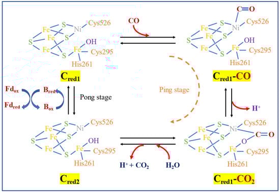The enzymatic reaction mechanism of CODH was proposed by Can [113] as a ping-pong reaction. The metal center (Ni for most of the acetogens including M. thermoacetica) of CODH Cred1 in the C-cluster bind CO by releasing one H+ and forming Cred1-CO2, then reacting with H2O by releasing another H+ and CO2 to form Cred2. The electron produced is then transferred to ferredoxin to re-form Cred1, as shown in Figure 3.
