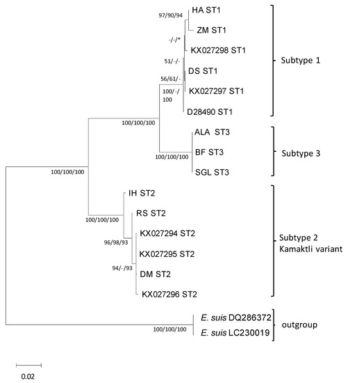Multiple alignments for phylogenetic analyses were performed using Muscle in MEGA software version 11 [21]. Three sequences representing ST1 (KX027297, KX027298 and D28490) and ST2 (KX027294, KX027295 and KX027296) were analyzed together with sequences obtained in this study. Two sequences representing E. suis were used as an outgroup (DQ286372 and LC1230019).