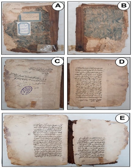 Some deterioration aspects of the components of the historical manuscript studied at Al-Azhar Library, Cairo, Egypt: (A,B) Leather binding, (C–E) Paper sheets.