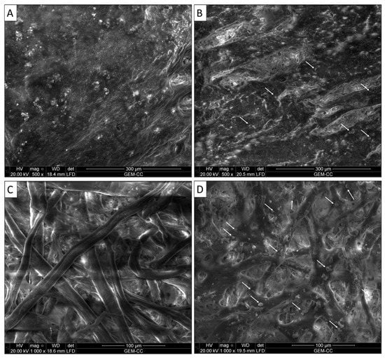 SEM images of paper and leather binding of the studied manuscript: (A) New vegetable-tanned leather binding, (B) historical leather binding, (C) Whatman paper (control), (D) historical paper. The arrows refer to microbial growth.