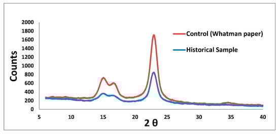 Native cellulose is recognized to possess a crystalline structure. Determining cellulose crystallinity is regarded as one of the most significant properties of cellulosic materials, as it provides insight into their mechanical, physical, and chemical capabilities. Within the amorphous and crystalline sections of the fiber cell wall, the cellulose molecules are organized in fibrils [36]. The data obtained showed that the crystallinity index of the Whatman paper sample (control) was 82%, and for the historical paper it was 69% (Figure 3). It was evident that changes in the environment, particularly an increase in relative humidity, had an impact on the crystallinity of cellulose. Because the Whatman paper contains more than 95% cellulose, it has a high degree of crystallinity in general [37]. The present investigation revealed that the crystallinity of the historical paper was significantly lower in comparison to the control sample. This reduction can be attributed to various deterioration factors, including the rising temperature and decreasing moisture content, which lead to the damage and destruction of the amorphous regions of cellulose. Additionally, microbial activity can contribute to the formation of fossilized and hardened papers [38,39].
