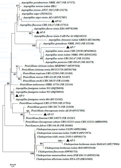 Fungi are considered the main source for the biodeterioration of historical manuscripts because the subject offers a source of nutrients and carbon that supports the growth of fungi [40]. Among fungal deterioration, symptoms are increasing brown spots, brittleness, discoloration, and weakening of the paper [25]. In the current study, culture-dependent methods were utilized to isolate fungi from the swabs collected after being pressed onto highly deteriorated areas. Twelve fungal strains were obtained from the collected swabs and subjected to identification at first based on morphological, cultural, and microscopic examination. According to standard keys, these fungal strains were identified as Cladosporium spp. (two isolates coded as AF-1 and AF-2), Aspergillus fumigatus (five isolates coded as AF-3–AF-6, and AF-8), A. ustus (one isolate coded as AF-7), A. flavus (two isolates coded as AF-9 and AF-10), A. niger (one isolate coded as AF-11), and Penicillium chrysogenum (one isolate coded as AF-12). In a similar study, 31 fungal strains were isolated from an old manuscript collected from the Universitas Indonesia Library and classified based on morphological identification into Aspergillus spp. (fourteen isolates), Penicillium spp. (five isolates), Cladosporium spp. (eight isolates), Curvularia sp. (one isolate), Ulocladium sp. (one isolate), and yeast-like fungi (two isolates) [40]. Additionally, the most common fungal strains associated with deteriorated historical manuscripts dated back to the 17th century belong to Aspergillus flavus and Aspergillus niger [41]. Moreover, the Aspergillus and penicillium species were the most common fungal strains isolated from 79 deteriorated old manuscripts collected from Astan-Quds Library, Mashhad, Iran [42]. Oetari et al. [43] reported that the fungal strains A. flavus, A. niger, A. versicolor, A. fumigatus, A. ruber, A. clavatus, and P. citrinum were isolated from a deteriorated manuscript collected from Indonesia. Cladosporium spp. such as C. colocasiae and C. herbarum were previously isolated from deteriorated historical Chinese manuscripts collected from the Central Library, Indonesia, and those collected from Mertasinga, Cirebon [44,45].