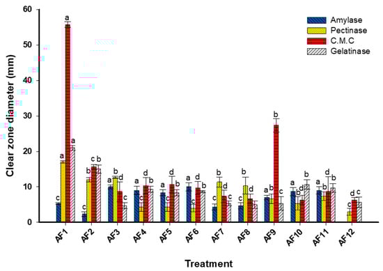 Hydrolytic enzyme activity of cellulase, amylase, pectinase, and gelatinase (mm) of different fungal strains isolated from the deteriorated historical manuscript. Different letters on bars for the same enzyme indicate that the mean values of the clear zone are significantly different (p ≤ 0.05) (n = 3).