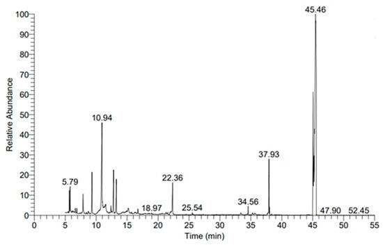 The antifungal activity of probiotic bacterial strains is associated with their metabolites secreted in the CFF (surrounding media) [59]. Therefore, the metabolic profile of the CFF of probiotic bacterial strain L. rhamnosus was detected by GC-MC analysis (Figure 6). As shown, the metabolic profile of L. rhamnosus contains > 50 metabolites based on the Wiely-9 and nist_ms libraries. These various metabolites were detected at RTs of 5. 67, 5.79, 6.87, 7.88, 9.32, 10.93, 11.57, 12.39, 12.81, 13.26, 15.2, 16.75, 22.35, 34.56, 37.93, 45.06, 45.14, 45.2, 45.29, and 45.49 (Figure 6, Table 1). Among these metabolites, different chemical compounds have low and high molecular weights, such as amides, acids, ethers, esters, alcohol, and carboxylic acids (Table 1). For instance, various acids such as lactic acid, propanoic acid, acetic acid, phenyllacetic acid, and hexa- and octadecanoic acid were observed. Moreover, esters such as methyl and ethyl, and butyl ester, were present in CFF. Various alcohols and amides were also present (Table 1). According to the published literature, different compounds that exist in CFF have various activities such as antifungal, anti-inflammatory, cytotoxicity, and food safety. For instance, phenyllacetic acid at an RT of 16.75 was reported as a promising antifungal agent for Aspergillus and Penicillium spp. [60]. Shehata et al. [59] reported that the metabolites secreted by Lactobacillus are strain dependent, which means the metabolites, and hence their activity, differ between various Lactobacillus strains.