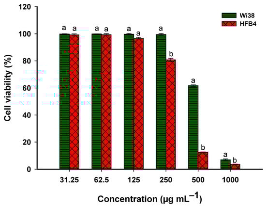 Biocompatibility of cell-free filtrate of L. rhamnosus with two normal cell lines, Wi23 (normal lung tissue) and HFB4 (normal human skin cells). Different letters on bars for the same concentration indicate that the mean values are significantly different (p ≤ 0.05) (n = 3).