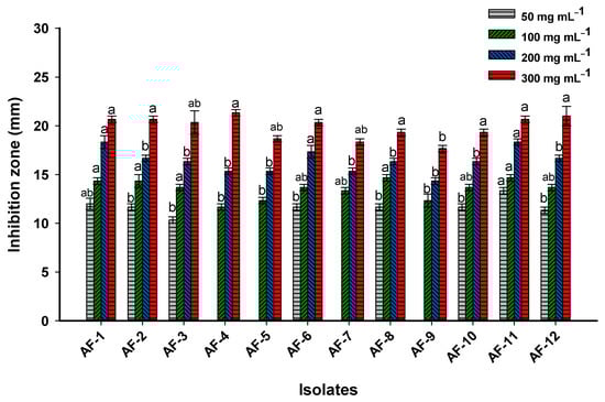 Data analysis showed that the antifungal activity of cell-free filtrate occurred in a concentration-dependent manner. As shown, the highest activity against all isolated fungal strains was recorded at a concentration of 300 µg mL−1. At this concentration, the maximum activity was recorded toward fungal strain A. fumigatus AF-4 with a zone of inhibition (ZOI) of 21.3 ± 0.6 mm, followed by the fungal strains C. herbarum AF-1, C. herbarum AF-2, and A. niger AF-11, with a ZOI of 20.7 ± 0.6 mm (Figure 8). The lowest activity of CFF at this high concentration was shown toward fungal strain A. flavus AF-9, followed by fungal strain A. ustus AF-7 and A. fumigatus AF-5, with ZOIs in the range of 17.7 ± 0.5 to 18.7 ± 0.6 mm. The antifungal activity was decreased at low CFF concentrations. For instance, although the activity of 100 µg mL−1 of CFF was still against all fungal strains, the ZOIs were decreased to the range of 11.7 ± 0.6 mm (for fungal strain A. fumigatus AF-4) to 14.7 ± 0.6 mm (for fungal strains of A. fumigatus AF-8 and A. niger AF-11) (Figure 8). Moreover, the CFF at a concentration of 50 µg mL−1 was active against 66% of the total fungal strains. The activity at this low concentration was lost toward fungal strains of A. fumigatus AF-4, A. fumigatus AF-5, A. ustus AF-7, and A. flavus AF-9 (Figure 8). The MIC value for CFF was 25 µg mL−1 for fungal strains AF-1, AF-2, AF-3, AF-6, AF-8, AF-10, AF-11, and AF-12. However, the concentration of 100 µg mL−1 of CFF represented the MIC value for fungal strains AF-4, AF-5, AF-7, and AF-9.