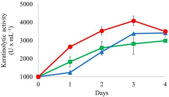 Keratinolytic activity of Streptomyces albidoflavus AN1 (green squares), Streptomyces drozdowiczii AD1 (blue triangles) and Streptomyces griseoaurantiacus AD2 (red circles) grown on CFMS (Chicken Feathers Mineral Salts) medium (pH = 8). Samples were collected every 24 h until cells reached the stationary phase to determine keratinolytic activity. Vertical error bars correspond to the standard error of the mean of three replicates.