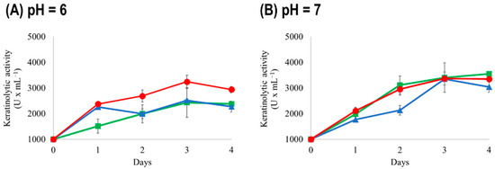 Keratinolytic activity of Streptomyces albidoflavus AN1 (green squares), Streptomyces drozdowiczii AD1 (blue triangles) and Streptomyces griseoaurantiacus AD2 (red circles) grown on CFMS (Chicken Feathers Mineral Salts) medium at two different pH. (A) pH = 6. (B) pH = 7. In all cases, samples were collected every 24 h and for 4 days to determine the keratinolytic activity. Vertical error bars correspond to the standard error of the mean of three replicated experiments.