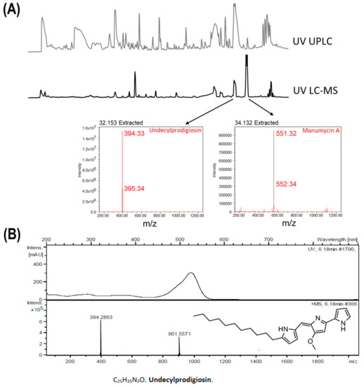 Identification of undecylprodigiosin and manumycin A metabolites present in the co-culture of Streptomyces albidoflavus AN1, Streptomyces drozdowiczii AD1 and Streptomyces griseoaurantiacus AD2 by LC-MS and LC-DAD-HRMS dereplication analyses. (A) UV chromatograms of both UPLC (grey) and LC-MS (black) analyses and MS analyses of the extracted UV peaks indicated by arrows; resulting in the identification of the metabolites manumycin A and undecylprodigiosin. (B) Identification of undecylprodigiosin by LC-DAD-HRMS dereplication analyses.