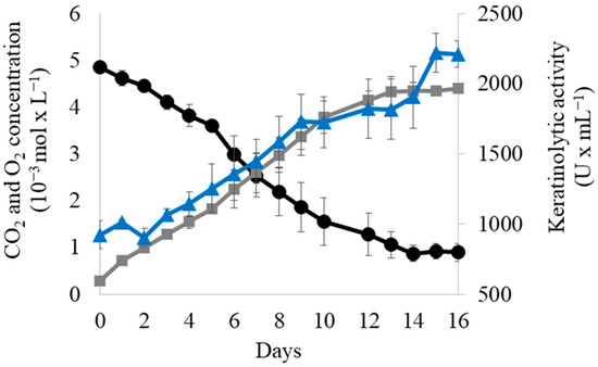 Growth and keratinolytic activity of Streptomyces albidoflavus AN1, Streptomyces drozdowiczii AD1 and Streptomyces griseoaurantiacus AD2 co-culture on chicken feathers as the sole substrate. Samples for growth (CO2 production and O2 consumption) and keratinolytic activity were collected every 24 h until O2 was depleted from the bottles. Blue triangles (keratinolytic activity), Grey squares (CO2 production) and Black circles (O2 consumption). Vertical error bars correspond to the standard error of the mean of two replicated experiments.