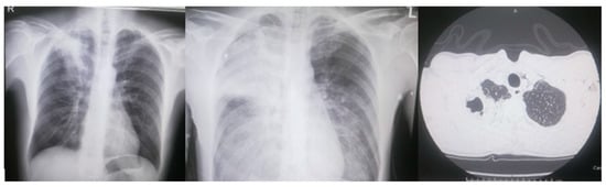 On the left: chest X-ray upon admission, with right upper lobe opacification. In the middle: chest X-ray 24 h after admission, with complete right upper lobe, right lower and left mid-basal opacification, diffuse thickening of bilateral lower-middle lung. On the right: right upper lobe opacification with a suspected air bubble inside at the CT angiography.