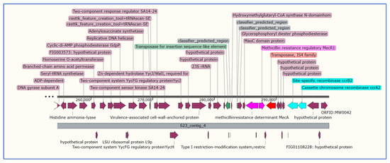 Staphylococcal chromosomal cassettes mec (SCCmec) (IVa(2B)) identified in isolate S21. The cassette chromosomal recombinase genes are in turquoise, the mecA gene and its regulator are in pink, transposase is in red, Transposase in green, and recombinase in cyan, purple 9ndicate the rest of genes.