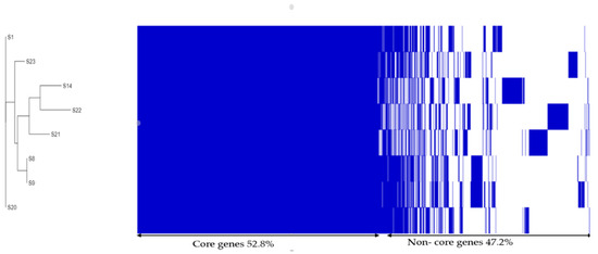 Core-genome phylogenetic analysis showing core and non-core genes in S. aureus isolates. On the left, the phylogenetic tree is built from 3837 core genes of the isolates. The blue heat map shows core genes (dark blue) and the blue boxes and white gaps show non-core genes. Each row represents the aligned sample.