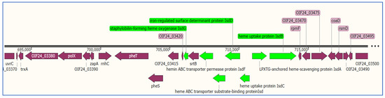 S. aureus needs iron to survive, multiply, and infect cells, hence it has evolved specific proteins to steal heme from its host. The iron surface determinant (Isd) system is a protein family that obtains nutritional iron from the host body, allowing the bacteria to multiply during infection [76]. Staphylococcal cell-surface proteins (IsdA, IsdB, and IsdH) are assumed to channel their molecular payload to IsdC, which subsequently facilitates the transfer of the iron-containing nutrition to the membrane translocation system IsdDEF [77]. According to Valenciano-Bellido et al. [76], IsdH, a surface protein, binds to hemoglobin (Hb) and absorbs the heme moiety carrying the iron atom. A cluster of iron surface determinants (Isd) have been identified similarly in all isolates, which includes LPXTG-anchored heme-scavenging protein (IsdA), heme uptake protein (IsdB), heme uptake protein (IsdC), iron-regulated surface determinant protein (IsdD), heme ABC transporter substrate-binding protein (IsdE), and hemin ABC transporter permease protein (IsdF) (Figure 3). The staphylobilin-forming heme oxygenase (IsdI) was detected separately in another contig. The Isd locus, which is required for the acquisition of iron from hemoglobin, was identified in this study in all of the isolates; the common presence of this locus in different staphylococcus species has been documented previously [2].
