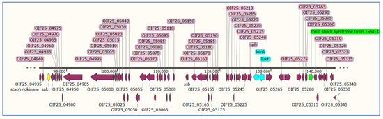 Map of a group of virulence genes located at the same contig in isolate S21 and surrounded by other staphylococcal proteins (purple). The green color shows the toxic shock syndrome toxin (TSST-1); leukocidins (lukGH) are colored in turquoise, the staphylokinase (sak) gene is colored in yellow, the leukocidins G and H are in cyan color, the rest of genes are colored in purple.