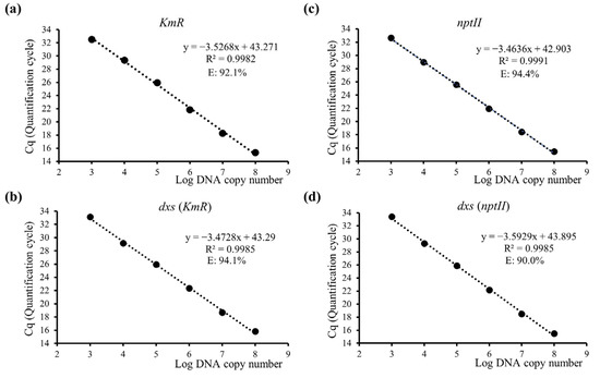 The qPCR dynamic ranges were evaluated in two bacterial strains, ranging from 10-fold (10−1) to 1,000,000-fold (10−6) cell dilutions, using 10 intra-qPCR runs. The average Cq values for the four dilution points showed linear regression with amplification efficiencies of 97.6% and 104.8% for KmR/dxs, and 97.7% and 103.6% for nptII/dxs (Figure 2c–f). Thus, cell suspensions of the two bacterial strains in this study were suitable for qPCR assays and exhibited reasonable qPCR efficiencies. Additionally, RSDr% values varied from 0.44 to 2.57 for KmR/dxs and 1.19 to 3.89 for nptII/dxs, indicating consistent qPCR results using cell suspensions.
