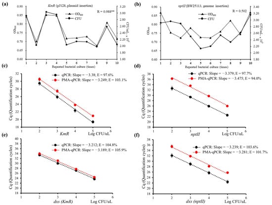 Dual-plex quantitative qPCR and propidium monoazide (PMA)-qPCR assays targeting KmR/dxs and nptII/dxs using serially diluted cell suspensions. (a,b) optical density at 600 nm (OD600) and colony-forming units ((CFU)/mL)) for 10 replicates of E. coli strain pJ281 and BW25113 cell culture, respectively; (c,d) linear regression of qPCR and PMA-qPCR for KmR and nptII, respectively; (e,f) linear regression of qPCR and PMA-qPCR for dxs of the two strains, respectively. Black triangles with dotted line represent OD600 values; black dots with solid line represent CFU/mL. Black and red dots with dotted lines denote average Cq values of qPCR and PMA-qPCR at each serial cell dilution, respectively. E—qPCR efficiency. ** p < 0.01.