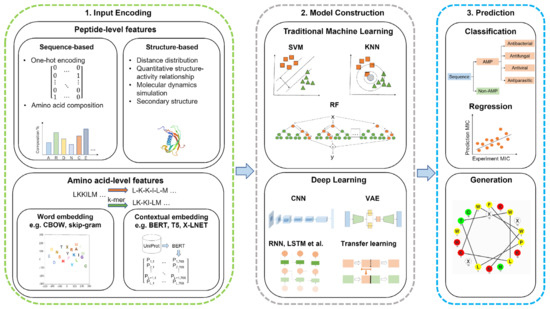 Machine learning adopts computation approaches to predict the structure and activity of AMPs through the classification of features into peptide-level and amino-acid-level features. The peptide-level features include sequence-based and structure-based features [193]. These computational approaches use statistics to sort and learn patterns in large amounts of data. Machine learning tools use the data provided by a database, known as a training set, to allow the models to learn and select the best features for the desired outcome. Validating this hypothesis on the new data uses a test set to ensure this model is effective [102]. Machine learning or deep learning models are used in the prediction and generation of AMPs. This scheme with input features, the construction of models, and prediction is shown in Figure 4.