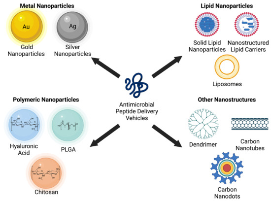- Martin-Serrano, Á.; Gómez, R.; Ortega, P.; de la Mata, F. Nanosystems as vehicles for the delivery of antimicrobial peptides. Pharmaceutics 2019, 11, 448. [Google Scholar] [CrossRef]