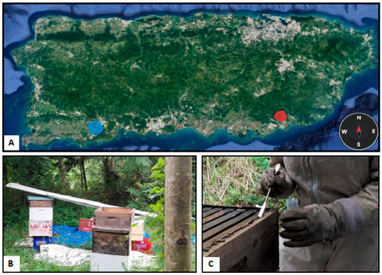 Propolis sampling sites. (A) Map of Puerto Rico Island showing the locations of the apiaries in Yauco (colored blue) and Arroyo (colored red) areas. (B) Detail of some hives of the Arroyo area. (C) Detail of propolis sampling from the edge of the hive structure.