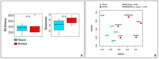 The bacterial community richness in the two areas was not statistically significant, but the bacterial community of Arroyo showed a Shannon index higher than that of the Yauco area (Figure 2A). However, the analysis of variance (ANOVA) showed no statistically significant differences (p-value > 0.05) between the two areas in terms of alpha diversity. Communities’ dissimilarity was evaluated by non-metric multidimensional scale analysis (NMDS) (Figure 2B). Results of the PERMANOVA showed a statistically significant pattern among the samples (p value < 0.05): samples from the same area were slightly clustered, with a stress value = 0.09, suggesting minor but statistically significant dissimilarity between the bacterial communities of the two areas.