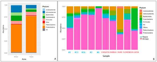 Microbial composition analysis at phylum level averaged by area (A) and sample (B). Each bar represents the relative abundance of a bacterial phylum. Phyla with an abundance <1% were grouped under the label “Others”. NA = not available.