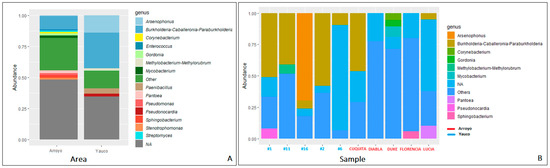 Microbial composition analysis at genus level averaged by area (A) and sample (B). Each bar represents the relative abundance of a bacterial genus. Genera with an abundance <1% were grouped under the label “Others”. NA = not available.