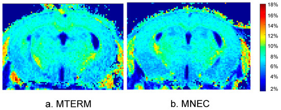 Macromolecular proton fraction (MPF%) map in a four week old mouse in MTERM (a) and MNEC (b) groups. Color bar indicates pseudo-color mapping of MPF in percent units.