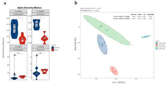 Fecal samples were collected from pups colonized with human fecal samples from term infants (MTERM) and preterm infants who went on to develop NEC (MNEC) at two and four weeks of age. Samples from MTERM (n = 8) and MNEC (n = 6) pups at two weeks of age and MTERM (n = 13) and MNEC (n = 7) pups at four weeks of age were subjected to 16S rRNA sequencing. There was significant difference in species richness and evenness (α-diversity) measured by Inverse Simpson (InvSimpson) (p < 0.05) and Shannon (p < 0.001) diversities between MTERM and MNEC fecal samples at two weeks of age (Figure 2a). The measured α-diversity indices at four weeks of age between the two groups were not significantly different. We then evaluated microbiome sample clustering using the Bray–Curtis dissimilarity metric based on all operational tax taxonomic units (OTUs). PERMANOVA analysis, as reflected in the principal coordinate analysis plot (PCoA), revealed that there was an overall significant separation (β-diversity) in the fecal microbial communities among the four groups by PERMANOVA (Figure 2b, p = 0.001). Pairwise, post hoc tests revealed that β-diversities were statistically significant between MTERM and MNEC fecal samples at two and four weeks old (both at adjusted p = 0.002), suggesting an overall compositional difference among the two treatment groups at both ages.